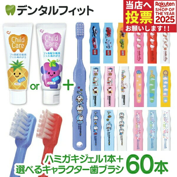 当店は楽天市場にて年間MVP賞である『 ダイエット健康ジャンル ジャンル賞』と『ROOM賞』を受賞している店舗です。 (受賞対象期間:2022年12月〜2023年11月) 子供向け キャラクター 歯ブラシ 60本(30本×2箱)と Ci チャイルドケア 1本/70g (グレープ味、パイン味) のセット! 歯科医院専用商品(Ciメディカル歯ブラシ) 【持ち手の特徴】 グリップ側面が指にフィットするウェーブ形状と背面の凹凸で握りやすく開発されています。 お子様でも力をいれずに歯みがきをすることができるので、手が疲れにくく、最後まで丁寧なブラッシングができるのです。 【ヘッドの特徴】 歯ブラシをついつい噛んでしまいがちな子、いませんか? 歯ブラシを噛むと、ブラシヘッドへのダメージにより、毛が抜けてしまうことがあります。 Ci502歯ブラシはこの対策として、ヘッド部分が通常の子供用歯ブラシより厚めに設計されており、深くしっかりと植毛されています。 毛が抜けにくい設計で安心してご使用いただけるのです。 もちろんお子様の小さなお口にも合うよう、ヘッドサイズは小さめ設計。 対象:乳幼児〜小学校低学年 全長:141mm 持ち手部分の長さ:およそ80mm ヘッド:9×18mm 毛の長さ:8mm ヘッドの厚さ:約4.5mm 持ち手の最大幅:約16mm 毛種:ナイロン 耐熱温度:80度 ●日本製・個包装 Ci チャイルドケア 1本/70g(グレープ味・パイン味) 子供だけでなく大人も使えるハミガキ剤です。 グレープ味、パイン味共にノンメントール(ミント無配合)なので、スースーした後味が苦手なお子様におすすめです。 フッ素(濃度970ppm) ・歯質を強化して酸に溶けにくい丈夫な歯をつくる。 ・プラーク(歯垢)の中に潜んでいる虫歯の原因となる菌の働きを抑制します。 ・歯の再石灰化を促進する。 キシリトール(容量70g中約4分の1の配合率) ・虫歯の原因となる歯垢や酸を作らない。 ・歯の再石灰化を促進する。 発泡剤や研磨剤は配合されておらず、子供のやわらかい歯を傷つけません。 ジェルは乳白色で色素無配合ですが、グレープ味のみ「パミスエキス(※1)」が配合され色素(※2)もあります。 パミスとはワイン製造時等に残る、ブドウ等の搾り粕のことです。 ブドウの果皮・種・梗などの混合物から構成され、オレアノール酸や、アントシアニンなどのポリフェノール類が含まれています。 パミス中に含まれるオレアノール酸は、虫歯菌などのレンサ球菌の増殖を特異的に抑制することが分かっています。 ※1 グレープ味の色素「パミスエキス」は成分に記載されていませんが、微量に配合されています。 ※2 色素として赤色106号、青色1号、橙色205号も配合されています【使用方法】適量を歯ブラシにとりブラッシングします。 最後に少量の水でうがいをします。(※少量洗口をすることでフッ素がお口の中に多く残るのでオススメです。) 【成分表示】●パイン:溶剤(精製水・エタノール)、甘味剤(キシリトール)、湿潤剤(ソルビット液・濃グリセリン)、基剤(無水ケイ酸)、粘結剤(カルボキシメチルセルロースナトリウム)、香味剤(香料:パインタイプ)、可溶剤(ポリオキシエチレン硬化ヒマシ油)、薬用成分(フッ化ナトリウム:フッ素・塩化セチルピリジニウム)(エデト酸塩)、防腐剤(パラベン) ●グレープ:溶剤(精製水・エタノール)、甘味剤(キシリトール)、湿潤剤(ソルビット液・濃グリセリン)、基剤(無水ケイ酸)、粘結剤(カルボキシメチルセルロースナトリウム)、香味剤(香料:グレープタイプ)、可溶剤(ポリオキシエチレン硬化ヒマシ油)、薬用成分(フッ化ナトリウム:フッ素・塩化セチルピリジニウム)、安定剤(エデト酸塩)、防腐剤(パラベン)、着色剤(赤色106号、青色1号、橙色205号) 【チャイルドケア970ppm・使用量の目安】 ・歯が生えてから2歳…2mm程度 ・3〜5歳…5mm以下 ・6歳〜大人…1.5〜2cm程度 \一緒に使いたいお子様向け歯磨き剤&フロス!/ Ci チャイルドケア4本セット★選べる風味の組み合わせ★ Ci こども用フロス★40本(ケース付き)★ 【ご注意(免責)事項】当店では、サイト上に最新の商品情報を掲載するよう努めておりますが、メーカーの都合等により、商品規格や仕様(容量・成分・パッケージ・原産国など)が予告なく変更される場合がございます。このため、実際にお届けする商品と商品ページ上の情報表記が異なる場合がございますので、ご使用前には必ずお届けした商品の商品ラベルや注意書きをご確認ください。また、商品情報についてページ表記以外の詳細が必要な場合は、メーカー等にお問合せください。※1 グレープ味の色素「パミスエキス」は成分に記載されていませんが、微量に配合されています。 ※2 色素として赤色106号、青色1号、橙色205号も配合されています \一緒に使いたいお子様向け歯磨き剤&フロス!/ Ci チャイルドケア4本セット★選べる風味の組み合わせ★ Ci こども用フロス★40本(ケース付き)★ 7,960円 税込 送料別 カードOK レビュー45件 歯科医院専売品のデンタルフィット ![]() | ||