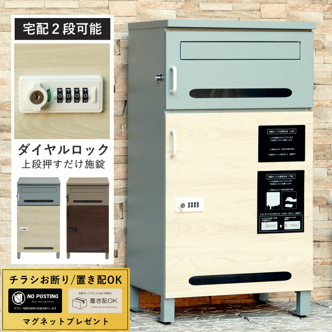 木目調 宅配ボックス付きポストの解説 郵便物、宅配物どちらも不在時に、荷物を受け取れるポスト付き宅配ボックス又はポスト一体型宅配ボックス。忙しいあなたや、配達の方にも優しい商品です。 ダイヤルロックとシリンダー錠(ダイヤル解錠番号が分からなくなった際の緊急用)の組み合わせタイプの鍵を使用しており防犯性が高いです。 高級感のある郵便受けが個性ある玄関を演出する宅配BOXです。 【セキュリティー】 上段は、プッシュキーで簡単に鍵の開閉が可能で、防犯面にも安心です。また、スペアキーが1本付属しております。 下段のダイヤルロックは、鍵を施錠した際、鍵を解錠した際にダイヤル番号が「0000」にリセットされ、設定したダイヤル番号の漏洩の心配がありません。 【上段宅配ボックス使用可】 扉側に捺印用の印鑑ホルダーが2個付属しており、上段も宅配ボックスとしての使用が可能です。マグネット式で任意の場所に取り付けることが可能です。※印鑑はご自身でご用意ください。 上段の投函口は大きなサイズ設計で、ネコポスやゆうパケットポストが投函可能です。 【配達マニュアル付き】 キー(2段すべて)、アンカーボルト、キーフック付印鑑ケース、宅配業者用の配達マニュアル(マグネット式でお好きな場所に貼付け可)が付属しており、お客様で追加でご用意 頂くものは特に必要なく、すぐにご使用頂けます。 【デザイン】 カラーは、本体カラーがミルクティーベージュと下段扉がブラウン木目の組み合わせと、本体カラーがブルーグレーと下段扉がホワイト木目の2色展開になります。 【錆びにくい加工】 ガルバナイズド処理を施している為、錆の発生がしにくい仕様となっております。 ※防水加工は施しておりませんので、軒下や屋根がある場所への設置を推奨致します。 【アンカーボルト付属】 脚部に地面固定用のアンカーボルト穴があり、地面と商品を固定することも可能です。 木目調 宅配ボックス付きポストの詳細 商品サイズ (約) 幅43.3×奥行37.5(取っ手込みサイズ)×高さ81(アジャスター込みサイズ)cm 【上段投函口】幅35.0×高さ3.3cm 【上段取出口】幅38.8×奥行32.7×高さ18.0cm 【宅配下段(内寸)】幅38.8×奥行30.7×高さ45.0cm 重量 (約) 13.8kg 材質 金属(鉄)・・・ガルバナイズド処理を施しています 塗装 粉体塗装 仕様 組立品(本体完成品・脚、取っ手のみ取付) 扉は約90度まで開きます。 キーワード 宅配ボックス ポスト 置き型 一戸建て用 大型 大容量 ポスト付き宅配ボックス ポスト一体型 ダイヤル式 ポスト付き 置き配ボックス スタンドポスト 置き型ポスト 郵便ポスト ポスト 戸建て 屋外 スタンド 自宅用 ダイヤルロック ダイヤル錠 置き配 ボックス 家庭用 おしゃれ 北欧 モダン アンティーク アンカー 埋め込み 郵便受け 複数投函 置き配ボックス スタンドポスト ステッカー パーセルボックス 配達マニュアル マグネット 宅配 ボックス 一体型 宅配ロッカー スタンド ポスト 宅配ポスト 門柱 据置型 配達ボックス 不在受取 置き配 ボックス 置き配ボックス テレワーク 在宅勤務 非対面 返品・交換について【必ずお読みください】 24,990円 税込 送料込 カードOK レビュー4件 AZmax Direct ![]() | ||