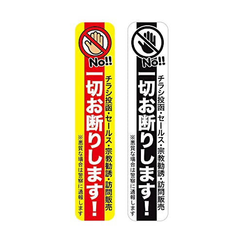 ◆商品名:チラシ投函 セールス 勧誘 訪問販売 一切お断りステッカー(7)インターホンミニタイプ 2枚セット 小さめセールスマン、防犯対策、訪問販売、宗教勧誘、新聞勧誘、NHKに効果てきめん! ポストやインターフォン、玄関ドア付近にご利用ください。サイズ1枚あたり:縦75mm×横15mm(※シールの特性上、記載のサイズより縮む場合があります。)耐候年数:3~5年(ご使用状況や貼りつけ場所によっては剥がれやすくなり耐候年数より劣る場合があります。)UV加工、防水加工※必ずセールスマン・勧誘を断れるとお約束する商品ではありませんセールスマン、防犯対策、訪問販売、宗教勧誘、新聞勧誘、NHKに効果てきめん! ポストやインターフォン、玄関ドア付近にご利用ください。 ※必ずセールスマン・勧誘を断れるとお約束する商品ではありません★注意事項★ シリコンオフなどで油分を落としてから貼りつけてください。 凹凸の無い平らな面に貼ってご使用ください。凹凸がある場所に貼ると剥がれます。 ご使用状況や貼りつけ場所によっては剥がれやすくなり耐候年数より劣る場合があります。 お使いのディスプレイによっては色の違いがありますので実際の色とは異なります。ブラックフライデー サイバーマンデー 寒さ対策 乾燥 年末準備 クリスマス イルミネーション 817円 税込 送料別 カードOK ミヤビ商店 ![]() | ||