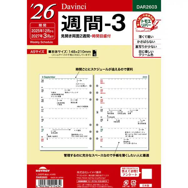 商品説明 薄い・かさばらない・裏移りが少ない。こだわりのダヴィンチリフィル。 手帳専用紙トモエリバー製。 軽くて薄いのに裏写りの少ない手帳専用紙トモエリバーを使用。 使用枚数の多い方、万年筆やマーカーなど多様な筆記具を使用される方におすすめ。 見開き両面2週間・時間目盛付き。 2週間を一覧できて見やすい。 時間目盛付きなので時間ごとのスケジュール管理がしやすくなっています。 商品仕様 規格 見開き両面2週間・時間目盛付き サイズ W148×H210×D3mm 内容 16ヶ月分、2025年12月~2027年3月 入数 72ページ(36枚) 1,309円 税込 送料別 カードOK ぶんぐたうん ![]() | ||