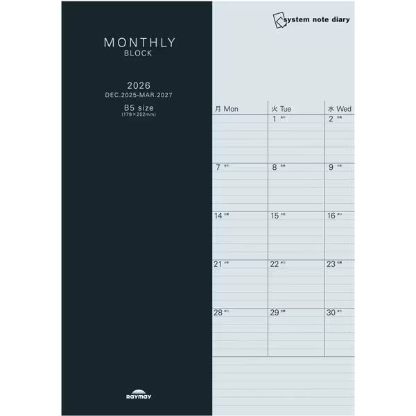 商品説明 自分仕様でカスタマイズできる、シンプルなノートダイアリー。 ビジネスでもプライベートでも使いやすい、ミニマルな表紙デザインと豊富なサイズラインナップが魅力。 ドット罫線入りで、文字や線が揃えやすく、自由度の高い記入が可能です。 スケジュール管理はもちろん、記録やメモにも最適な1冊。 <マンスリーブロック> 1ヵ月全体の予定を把握しやすい、見開き1ヵ月のブロックタイプ。 各ブロック内には6mm幅の罫線が入り、きれいに書き揃えることができます。 商品仕様 規格 マンスリーブロック(6mm罫線入り) サイズ W179×H252×D3mm 本体重量 103g 日付期間 2025年12月~2027年3月 605円 税込 送料別 カードOK ぶんぐる ![]() | ||