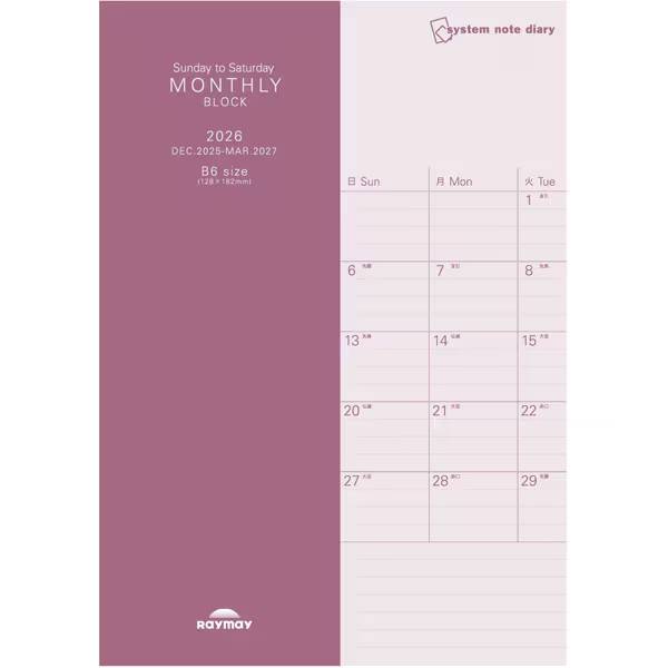 商品説明 自分仕様でカスタマイズできる、シンプルなノートダイアリー。 ビジネスにもプライベートにも適したシンプルなフォーマットと、豊富なラインナップが魅力。 ドット罫線入りで、文字や図を整えて書きやすく、スケジュール記入も快適です。 <マンスリー・ブロック(日曜始まり)> 1ヵ月の予定を見開きで確認できるブロックタイプ。 カレンダーと同じ日曜始まりで、プライベートの予定にもなじみやすい形式です。 商品仕様 規格 マンスリーブロック(日曜始まり) サイズ W128×H182×D3mm 本体重量 53g 日付期間 2025年12月~2027年3月 550円 税込 送料別 カードOK ぶんぐる ![]() | ||